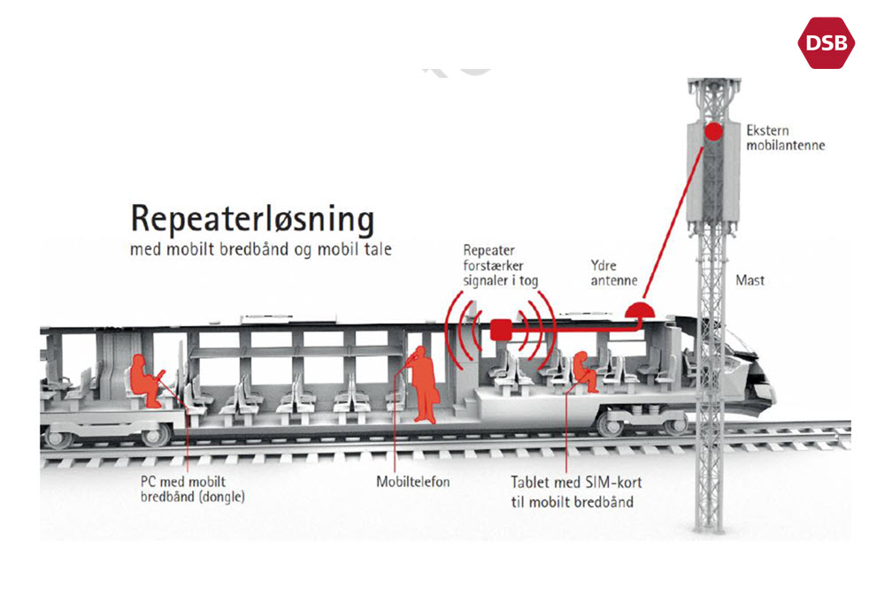 Banedanmark gennemfører sammen med togoperatørerne, Teleindustrien og mobilselskaberne projektet "Internet i Tog", som skal gøre toget til en fuldt funktionsdygtig arbejdsplads, og en væsentlig del af projektet er opsætningen af signalforstærkere, såkaldte repeatere, i DSB's fjern- og regionaltog