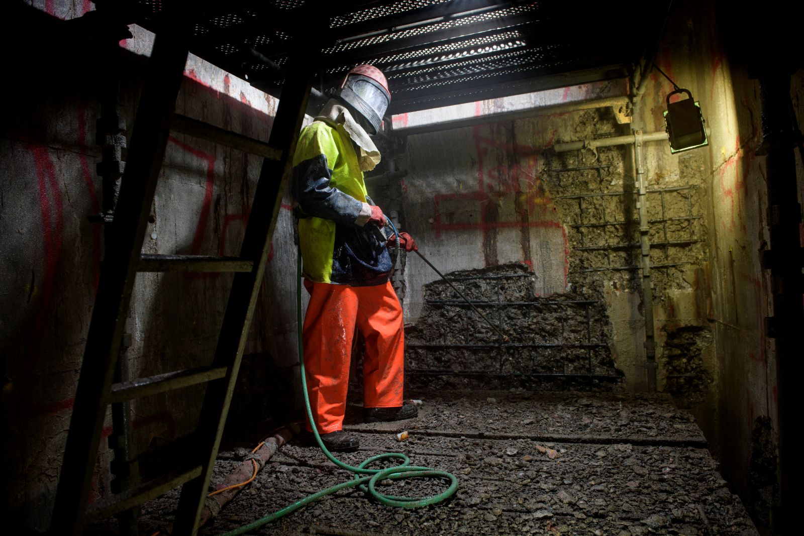 Efter en detaljeret kortlægning af betonkonstruktionens beskaffenhed blev det besluttet at foretage betonreparation af alle fri vægge og lofter i alle fire piller.