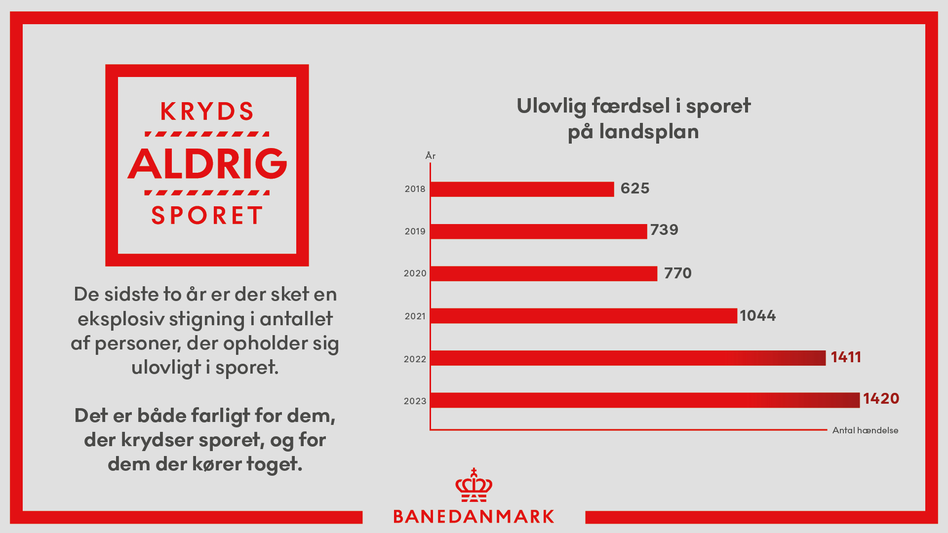 I 2022 og 2023 har Banedanmark registreret en eksplosiv stigning i antallet af personer, der ulovligt krydser sporet. Stigningen er både sket på S-banen og på fjernbanen. I 2022 og 2023 var der flere end 1400 tilfælde af personer, der opholdt sig ulovligt i sporet. Det er næsten en fordobling af tilfælde i forhold til årene 2018-2020.